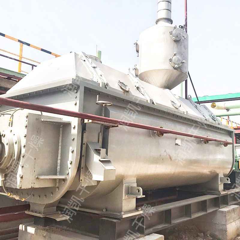 空心軸上密集排列著楔型中空漿葉,熱介質(zhì)經(jīng)空心軸流經(jīng)漿葉。單位有效容積內(nèi)傳熱面積很大,熱介質(zhì)溫度從40℃到320℃,可以是水蒸汽,也可以是熱水或?qū)嵊偷取鳠峤橘|(zhì)通過旋轉(zhuǎn)接頭,流經(jīng)殼體夾套及空心攪拌軸,空心攪拌軸依據(jù)熱介質(zhì)的類型而具有不同的內(nèi)部結(jié)構(gòu),以保證^佳的傳熱效果。 在漿葉及夾套通入蒸汽加熱的同時,出料口上部同時通入經(jīng)過加熱后的干空氣進(jìn)一步干燥,這樣大大增加了設(shè)備的干燥強度。蒸發(fā)出來的水分由尾氣帶出干燥機,經(jīng)過布袋除塵器過濾,將干燥后的細(xì)粉回收下來,濕空氣由水除塵后引風(fēng)機排出室外。
